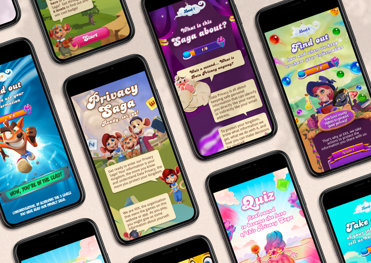 Our research with CNIL had shown that children and teens respond very well to the design of legal information that mirrors their experience on the rest of the interface - while they strongly reject any design they deem too childish. So our UX designers leveraged King's incredible in-game assets to create a unique privacy experience that echoes the user experience in King's games themselves.